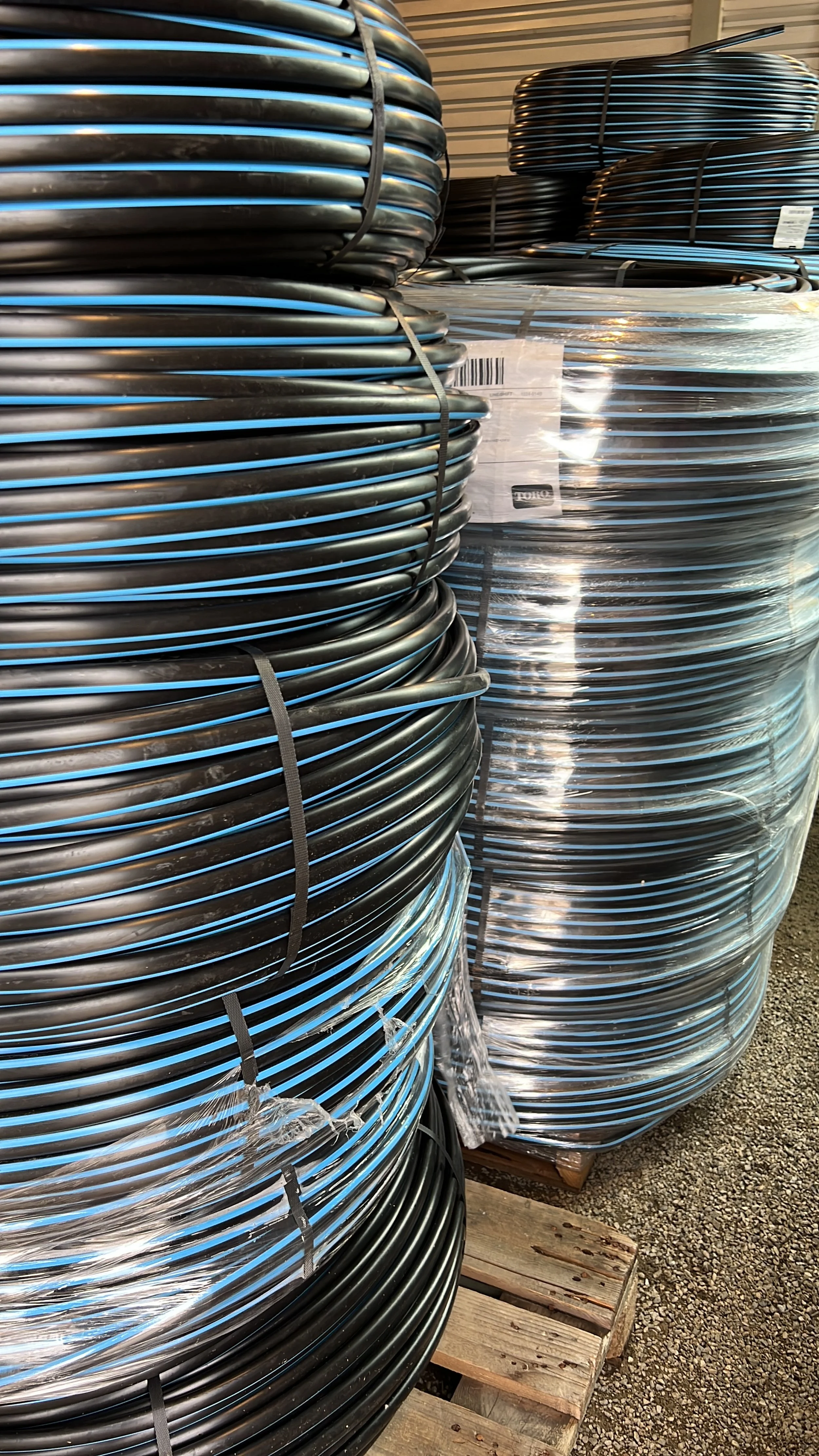 La manguera redonda Blue Stripe también está disponible en blanco, ideal para aplicaciones de riego por goteo de invernaderos y viveros.